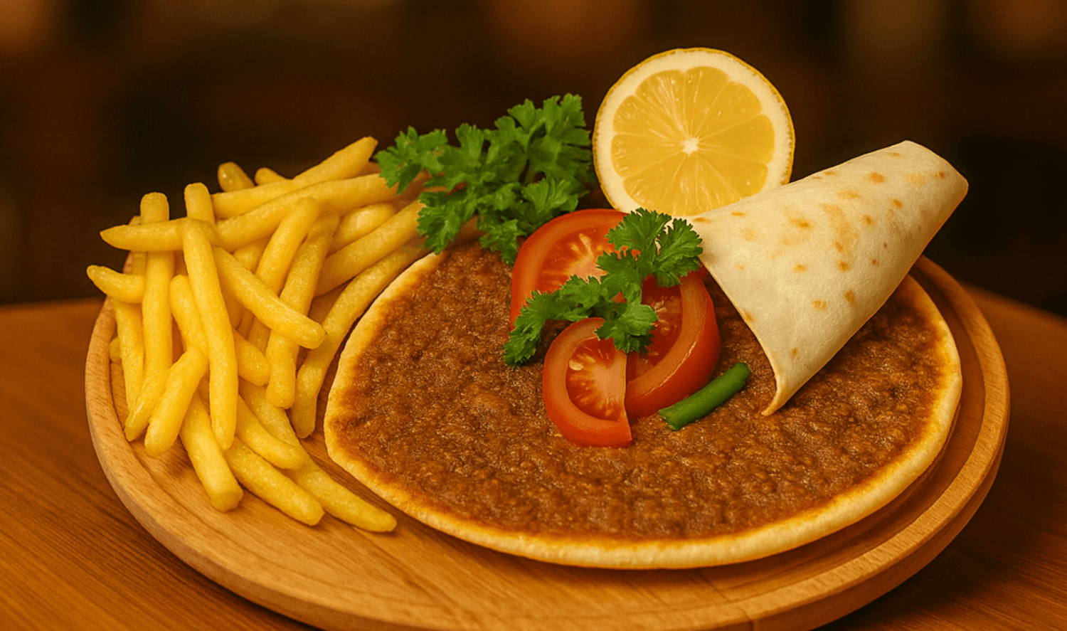 Pain turc garni de viande hachée épicée façon lahmacun, servi avec frites, salade et citron.