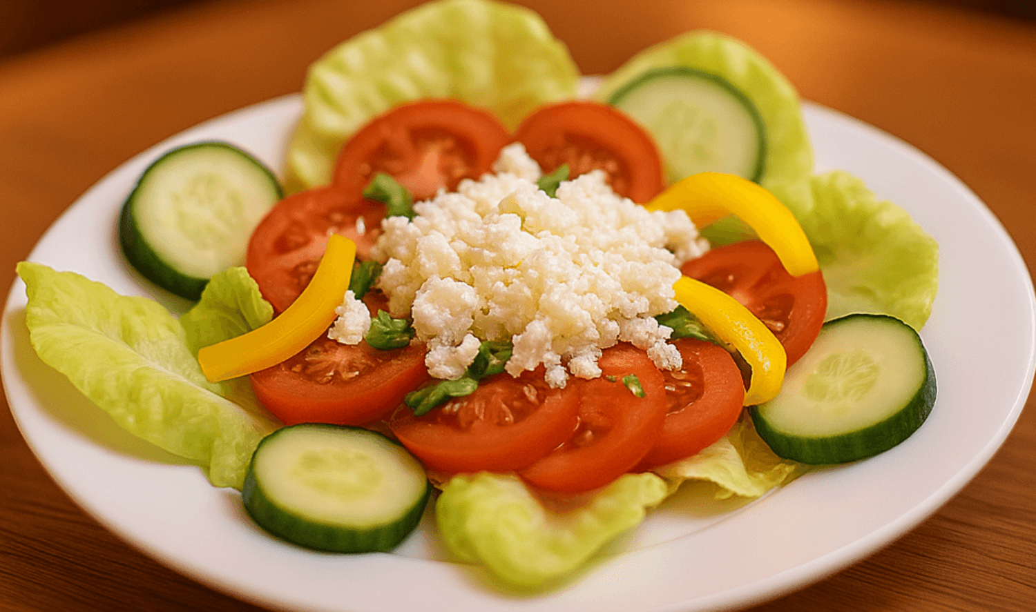Salade fraîche composée : laitue, tomates, concombres, oignons rouges, maïs et fromage râpé, avec sauce vinaigrette.